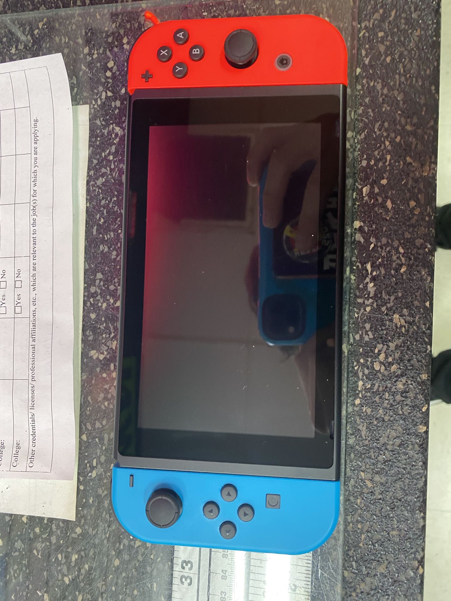 Nintendo switch With blue and red joy con controllers Has power cord/charger Does not have dock Or joypad Does not include games Screen is in perfect condition Fully functional and working Price is 250 plus tax Being sold from a storefront