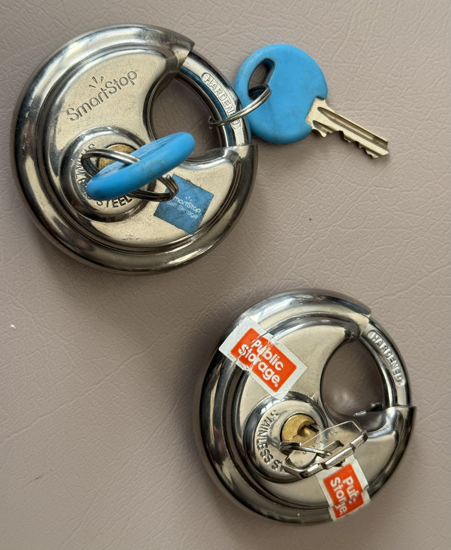 The 2 Round Lock Padlock Storage Unit Key is a set of stainless steel cylinder padlocks that are both waterproof and silver in color. These keyed padlocks feature a hidden/shrouded shackle, steel body and shackle material, and 4 pins for security. With an interior shackle width of 1 inch and height of 5/8 inch, these durable padlocks are suitable for both indoor and outdoor use, making them ideal for facility maintenance and access control needs. Made in China, this unit includes 2 padlocks, each with a unique key for locking and unlocking. GG
