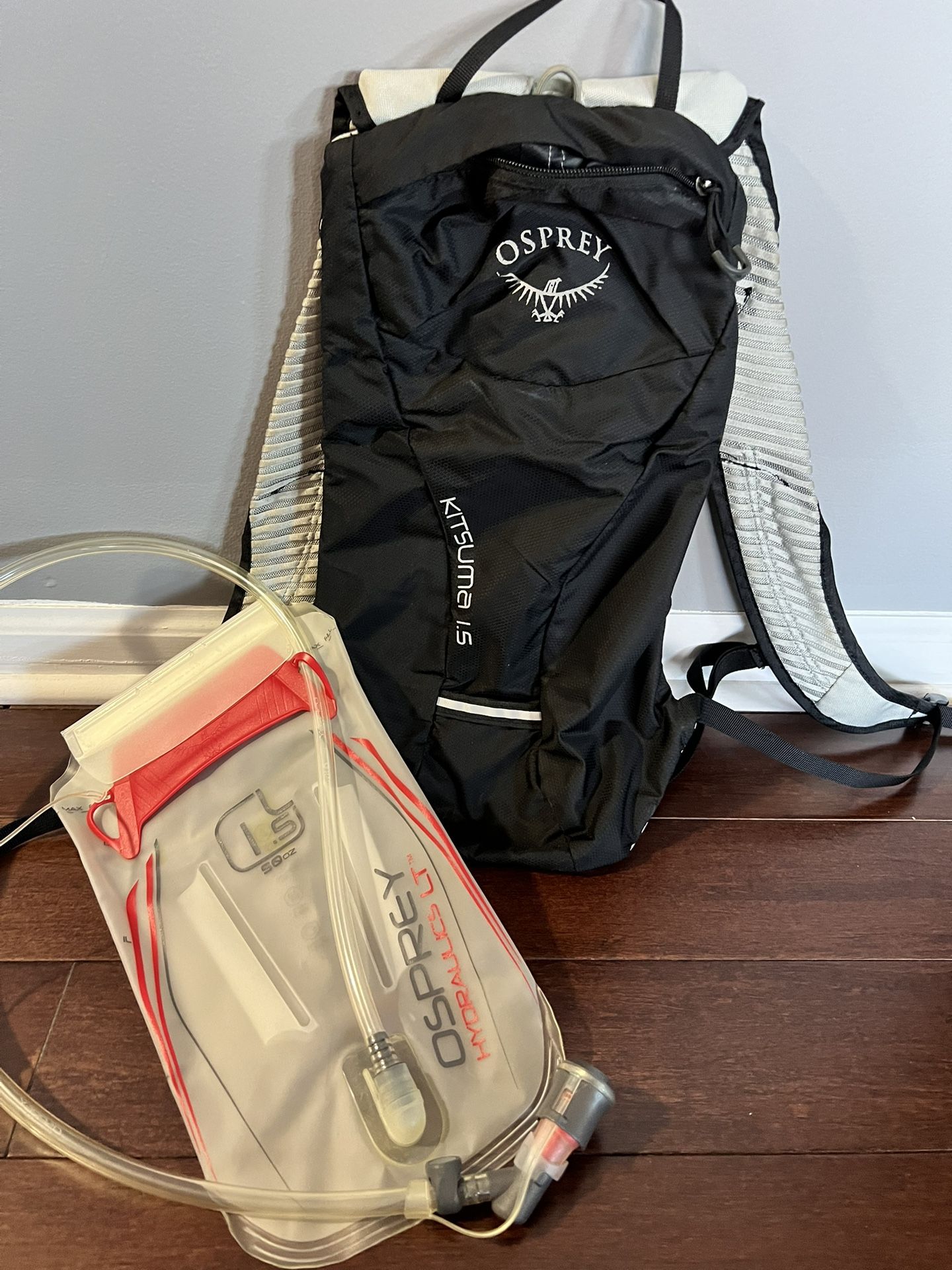 Osprey hydration daypack. 1.5L water bladder included. Cash only. Local pickup only. Smoke free/pet free home.