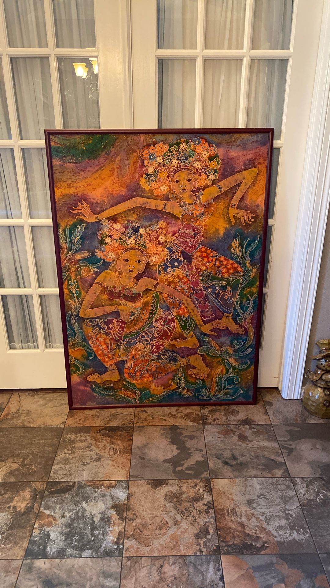 This is a large framed Balinese Batik framed painting. Signed by artist Arinbi. Measures 53”x38”, very good condition.