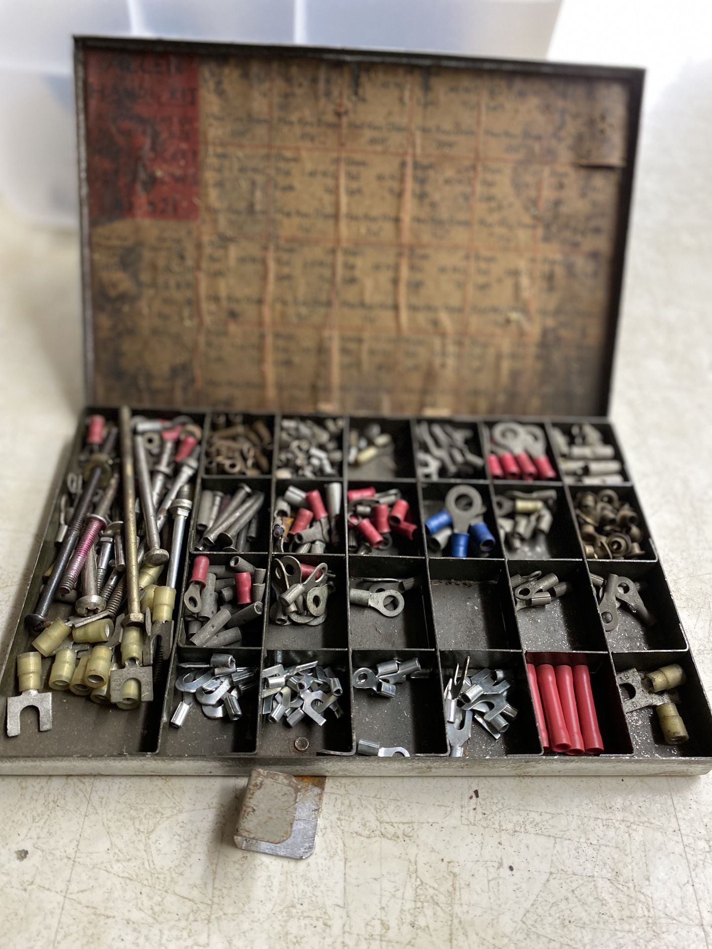 Mixed lot of electrical connectors, terminals, lugs, and hardware in metal organizer case. Includes various sizes and types: • Ring terminals • Spade connectors • Crimp ends • Misc hardware Condition: • Mixed new/used • Untested • Some wear from storage Good for electrical work, projects, or shop use.
