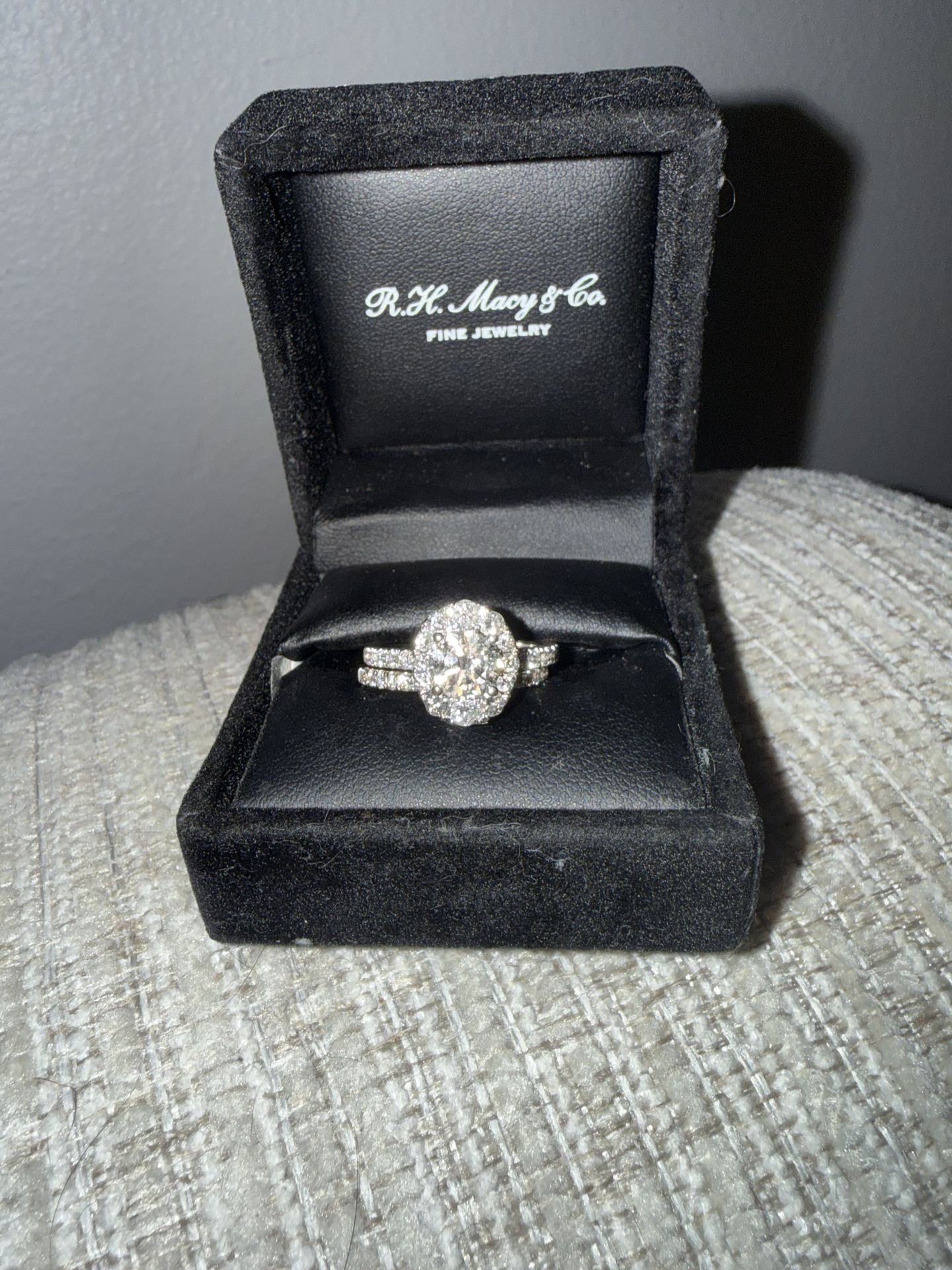 Engagement ring set featuring a 1.5 carat lab-grown diamond set in 14K white gold. Center stone: approximately 1.5 carat lab-grown diamond • Metal: 14K white gold • Includes matching band (engagement ring set) • Recently cleaned and polished • Barely worn, in excellent condition • Ring size: 7 This ring has great sparkle and presents beautifully in person. Originally priced around $5,000 and purchased on sale for approximately $2,000. Selling because it is no longer needed. Asking $485 Local meet-up only.