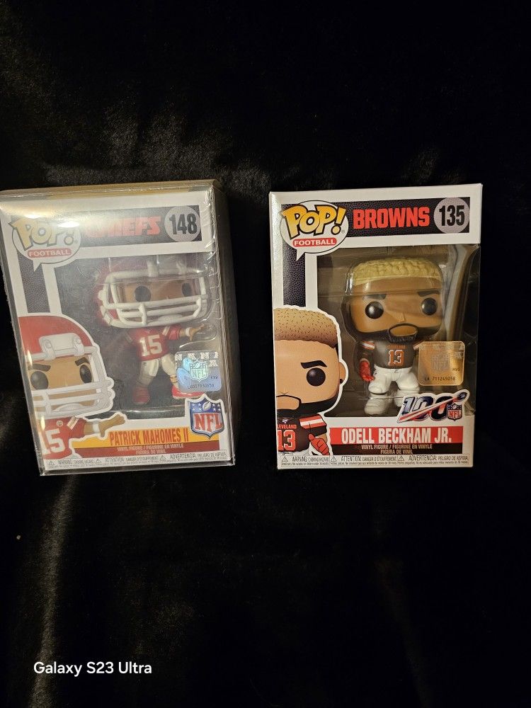 Awesome Funko Pop! NFL Football figures. You get Patrick Mahomes II from the Chiefs, Pop! #148, and Odell Beckham Jr. from the Browns, Pop! #135. Both are in their original boxes. Mahomes figure is also in a clear protective case.