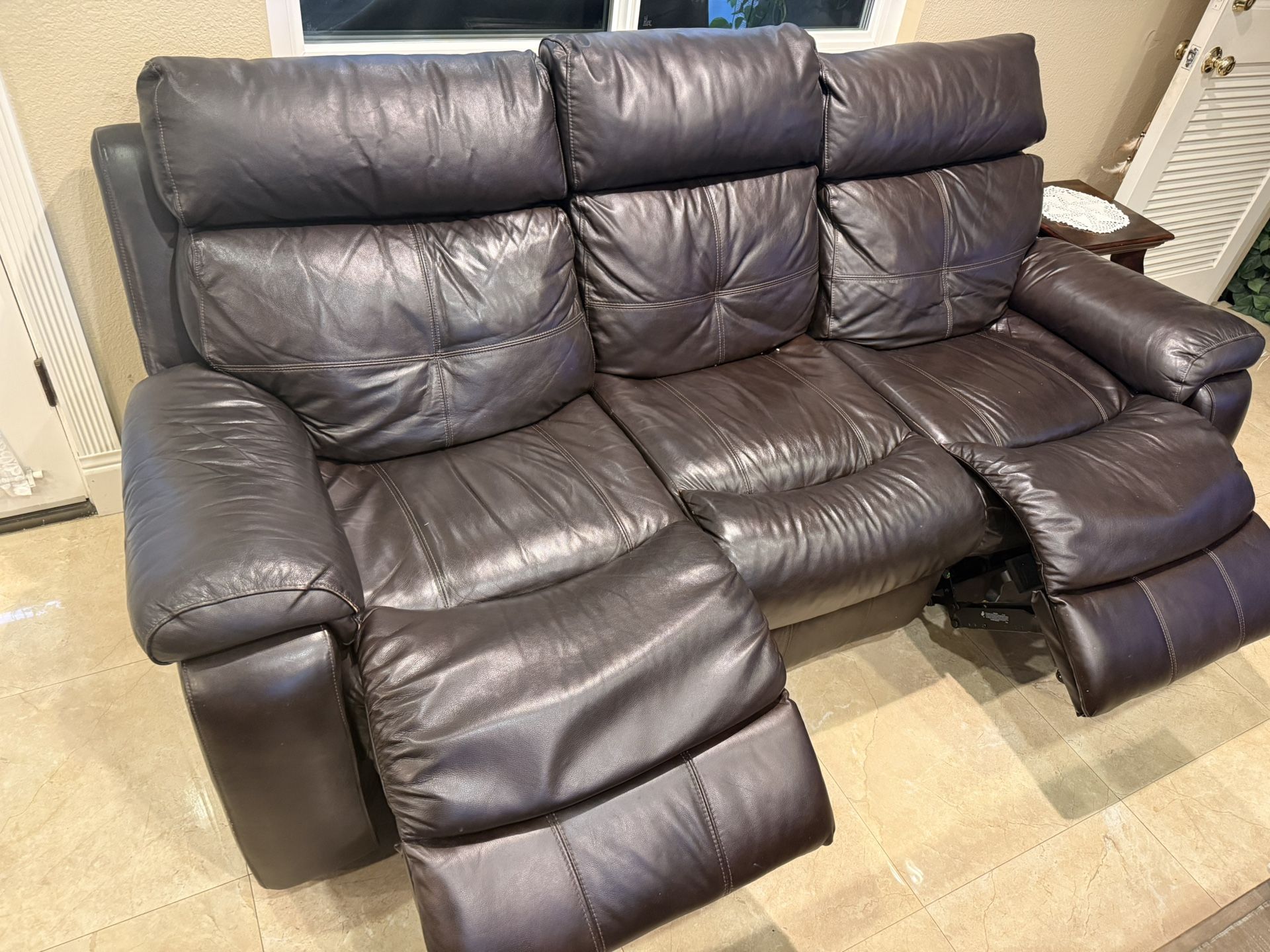 3 piece Dark Brown Leather Power Reclining Sofa β set, Great Condition Beautiful and very comfortable dark brown leather sofa with power reclining seats. All recliners work perfectly and move smoothly. The leather is in great shape with no major rips or damage. Very spacious and supportive β perfect for relaxing, watching TV, or family time. Well maintained and kept in a clean home. Ready for pickup. π Located in Lawndale / South Bay π² Asking $1500 (or best offer) Message me if interested!