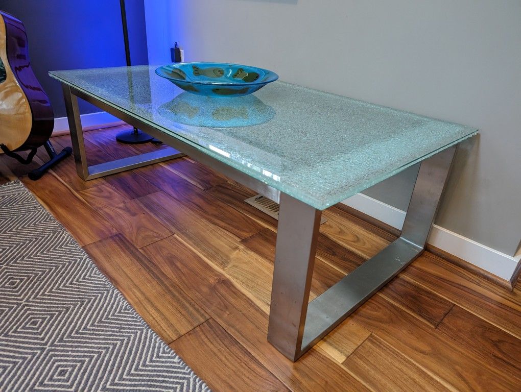 Super unique industrial style tables. I love them, but I'm changing up my style. The glass tops are tempered and very thick. Coffee table dimensions: 48" w x 26" d x 16" h End table dimensions: 26" w x 26" d x 20" h Flexible meeting times in the Canyon Park area of Bothell. Cash only. Don't forget to check out my other great offers. Always listing new items!