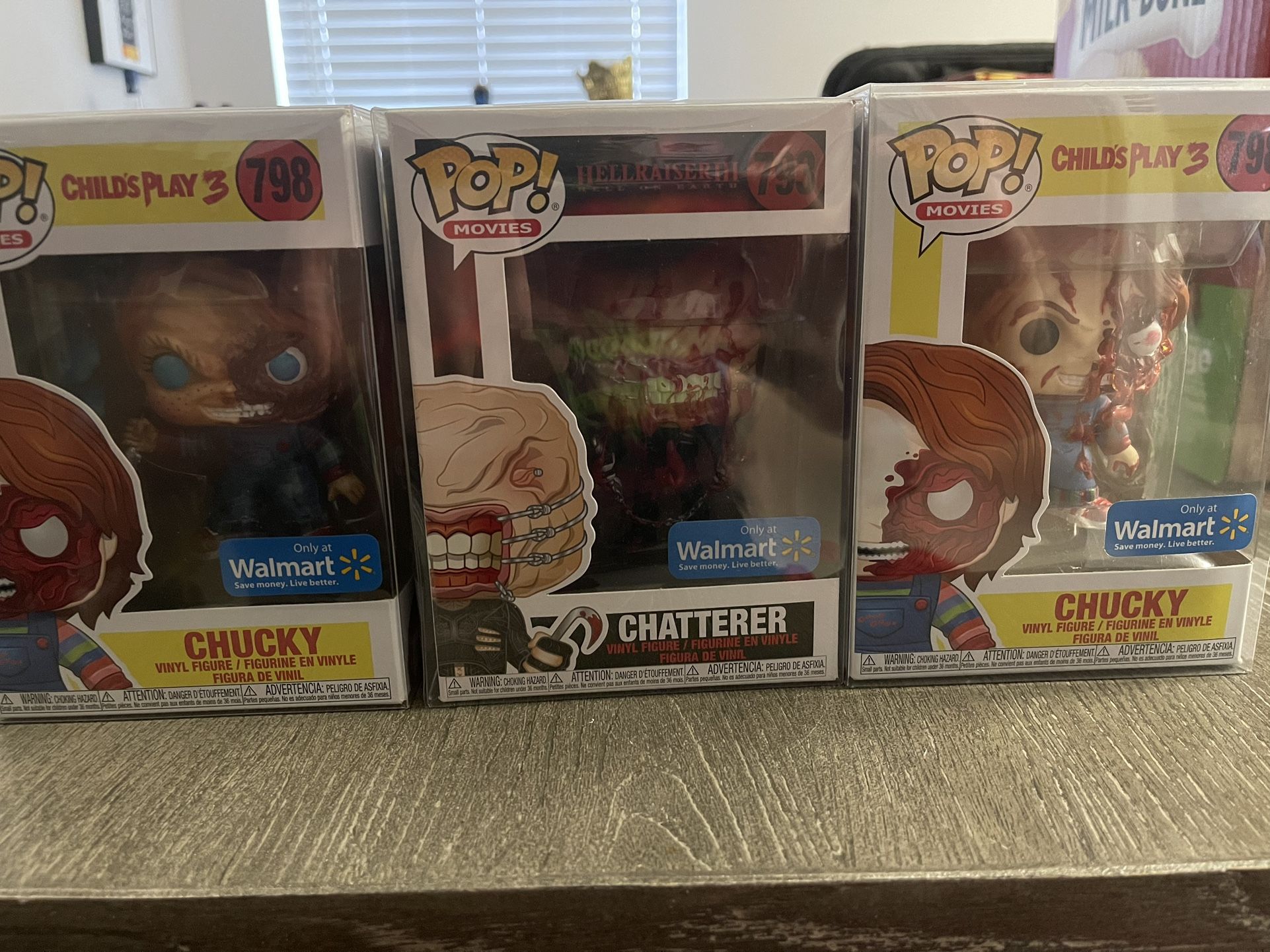 These are three Funko pops, one of a kind each. All three were Walmart exclusives . 2 Chucky 1 Hellraiser. What makes these 3 peices unique is that I had a movie make up artist do some work to them to make them look bloody, gorey, burned, ect. From head to toe there's a ton of extra detail added to each. Everyone that comes to my home absolutely falls in love with these, but it's time to find them a better place. All three come in a plastic Funko protector. I will accept reasonable offers.