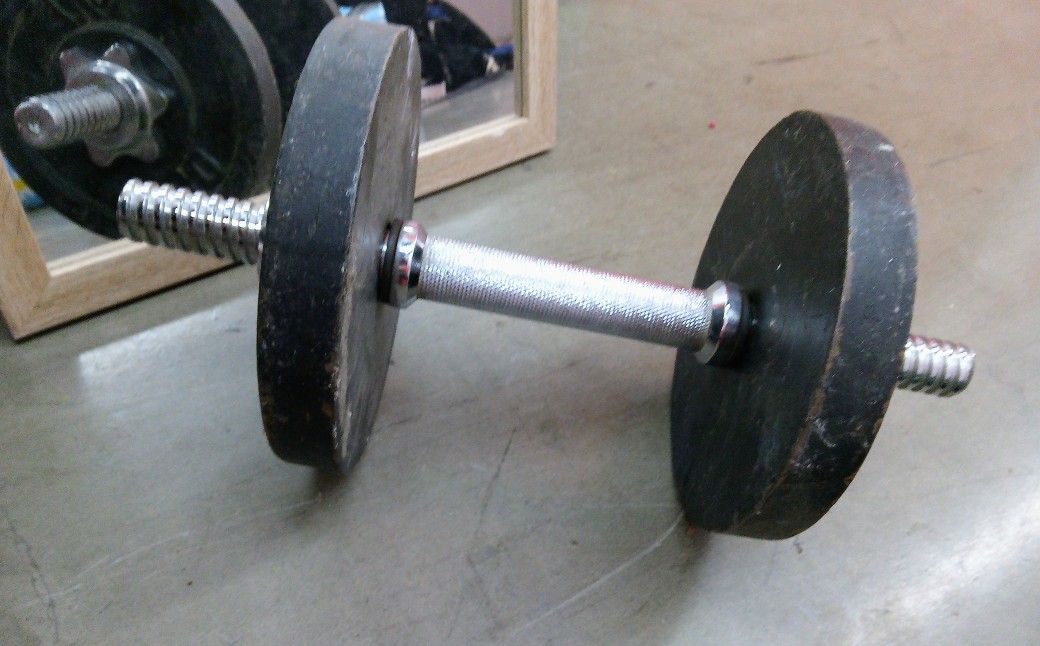 ONE DUMBBELL HANDLE WITH STAR LOCK COLLARS and SET OF TWO 7.5 LB. Cast iron BFCO WEIGHTS