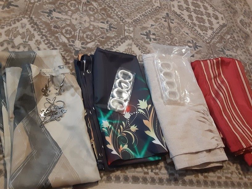 For sale, the whole lot of 4 different standard sizes fabric shower curtains. Also included a set of silver metal fleur di lis & two sets plastic white shower hooks. Pickup only in Maspeth Queens. They are used & in great condition, I moved & no longer need them. Great price, cheaper than purchasing just one. Used to change out my curtains seasonally. Check out my other sales, bundled deals. Thank u for looking.