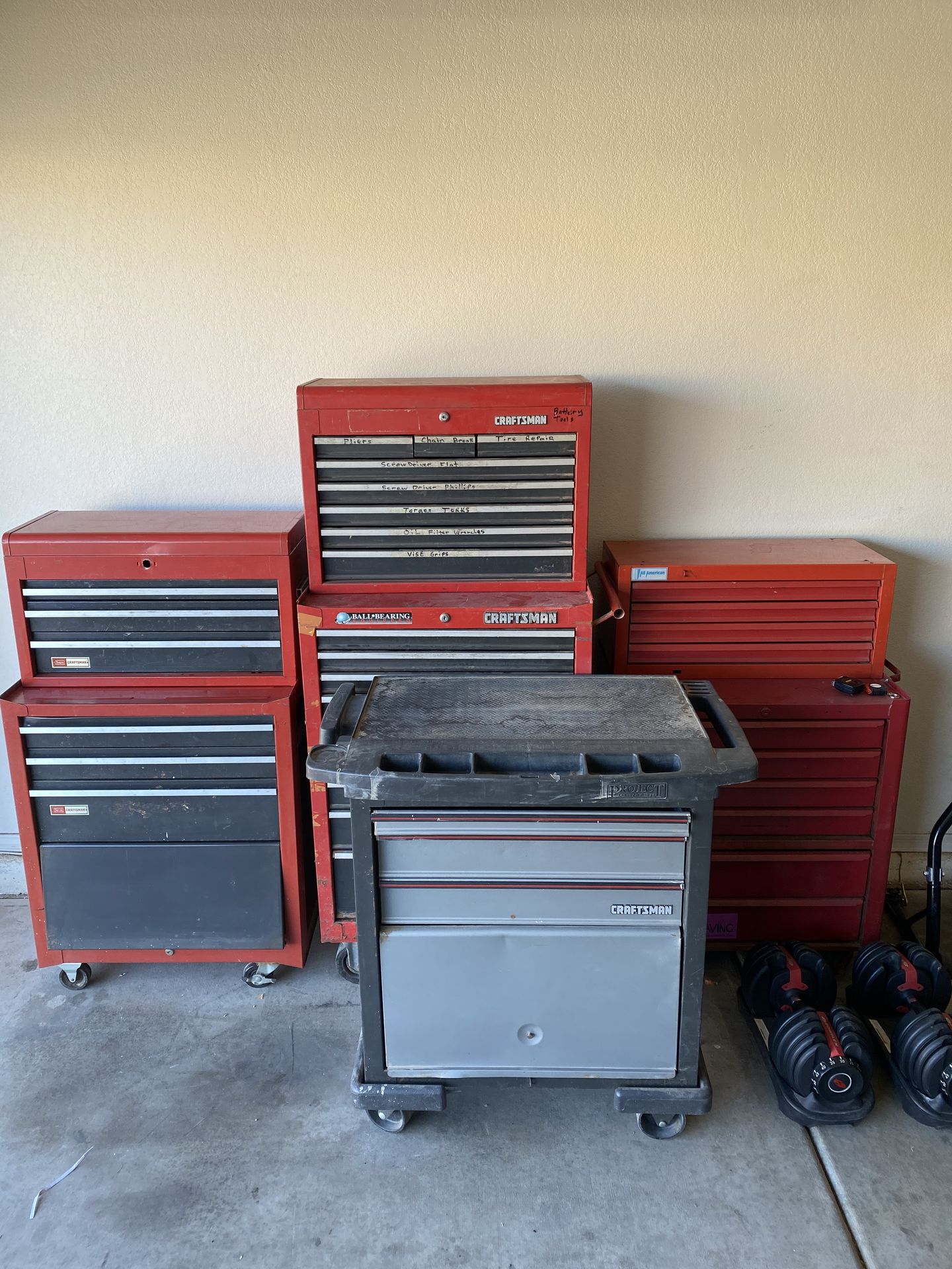 Back left $180 Back middle Sold Back right $180 Front $100 Pick Up Only Keywords Craftsman, husky, waterlod, snap on, blue point, mac tools, matco, us general, task force, stanley, dewalt, tool chest, tool box, tool carto