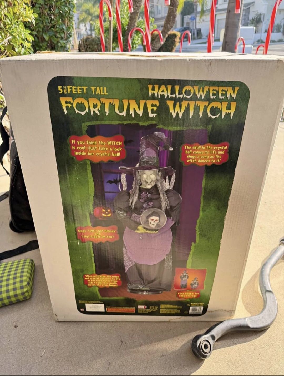 Gemmy Life Size Fortune Witch with box - very HTF. Works great. With microphone. Box has wear and tear from age. Will be in a secondary box to ship The Life Size Fortune Witch is an animated Halloween prop made in 2007-2008. She is dressed in a black and purple dress with a witch hat and holds a Spirit Ball with a skull inside. When activated, she swings her hips, moves her eyes, mouth and head while she talks and sings "I Put a Spell On You" while her eyes light-up. The skull moves his head and mouth to the phrases and sings "Just a Gigolo (I Ain't Got Nobody)" while his eyes also light-up.
