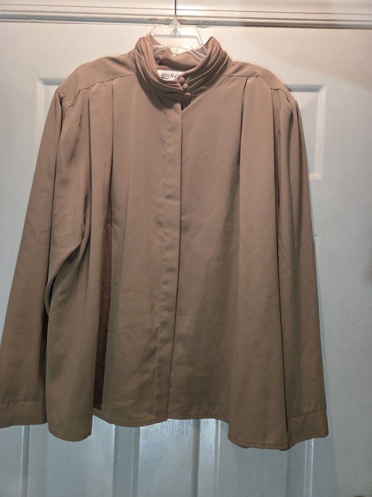 Chic beige top by Yves St. Clair. Versatile and elegant. Button up front, see photos ( missing bottom cover up button) . 28W , long sleeves with pleats at top ...