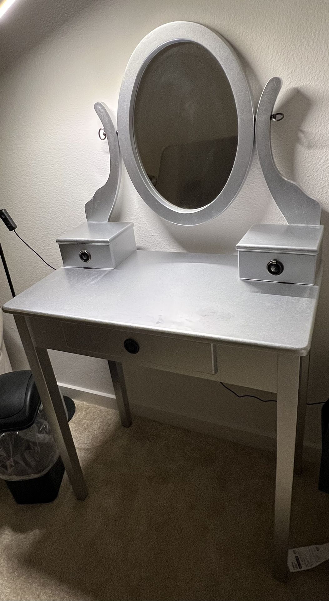 Silver vanity desk in good condition. Dimensions: 15.75”D × 30”W × 52.5”H. Made of wood and includes an oval rotating mirror. Comes with 3 drawers—two top drawers and one center drawer. The vanity is sturdy and fully functional. The top surface has some visible stains/wear (shown in photos), but it doesn’t affect use and can be covered with a mat or organizer. Overall still looks nice and works great for makeup, skincare, or bedroom use. • Color: Silver • Material: Wood • Weight: 31 lbs Pickup only.