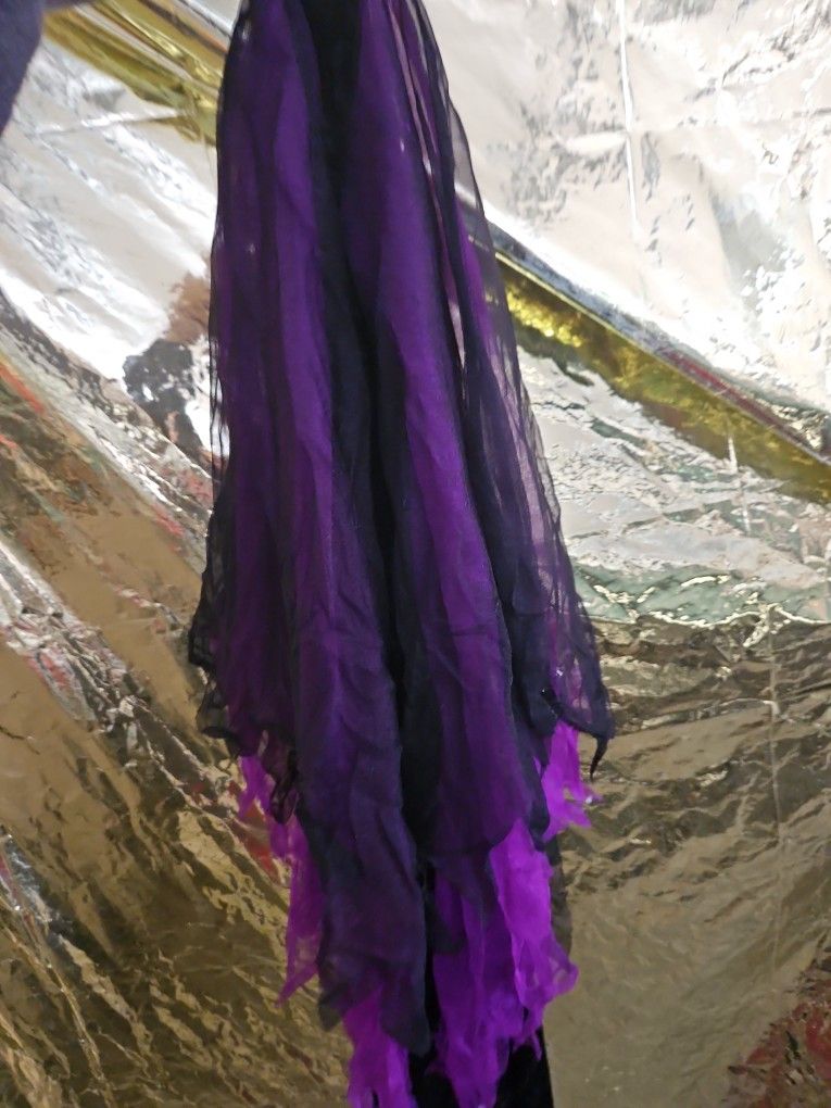 Black dress, purple and black sleeves. Purple belt. Size large