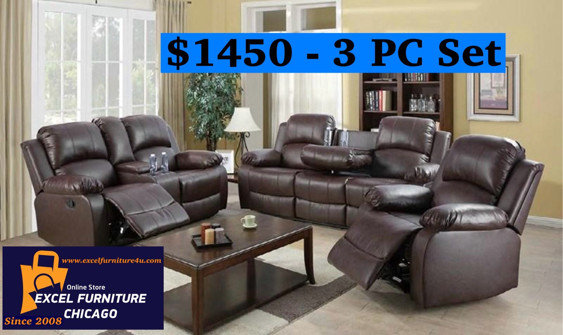 ORDER AND PAY UPON DELIVERY ( pay to the driver in your house) We work in Chicagoland area & around ( Chicago, Rockford, Milwaukee) Excelfurniture4u. com - Online Furniture Store RECLINER SOFA,LOVESEAT,CHAIR BRAND NEW FURNITURE !!!! Reclining Whole 3pc set Delivery -$75( possible the same day delivery) 6 months manufacturers warranty Sofa, couch , love seat, chair
