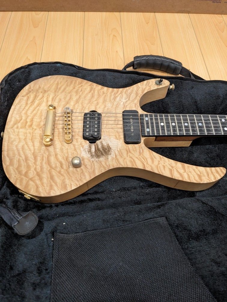 This was a passion project guitar I built with my dad. The body is alder with a stunning curly maple top. The neck is a custom Warmoth 24 fret mahogany shaft with ebony board. The top is flat, which highlights the figure of the wood. Although there's a lot of finish wear around the picking area, the bones of the axe are really good and will make an excellent overhaul project. Electronics are a DiMarzio Titan in the bridge and Duncan P90 in the neck, a 3-way selector and volume control. The sound is very full; it's a nice blend of a Strat and Les Paul. Body: - reverse strat shape - 7 piece alder - 1/8" curly maple top - clear varnish finish Neck: - Warmoth boat shape - mahogany shaft - ebony fingerboard - 24 frets with overhang Hardware: - Gotoh Tune O Matic Bridge, Gold - Gotoh Stop Tail Piece, Gold - Planet Waves Stereo Jack, Gold Plated - Dunlop Strap Lock Buttons Electronics: - Seymour Duncan P-90 (neck) - DiMarzio Titan (bridge) - 3-way selector: bridge, both, neck - volume pot Accessories: - Premium TKL gig bag - strap with Dunlop strap locks