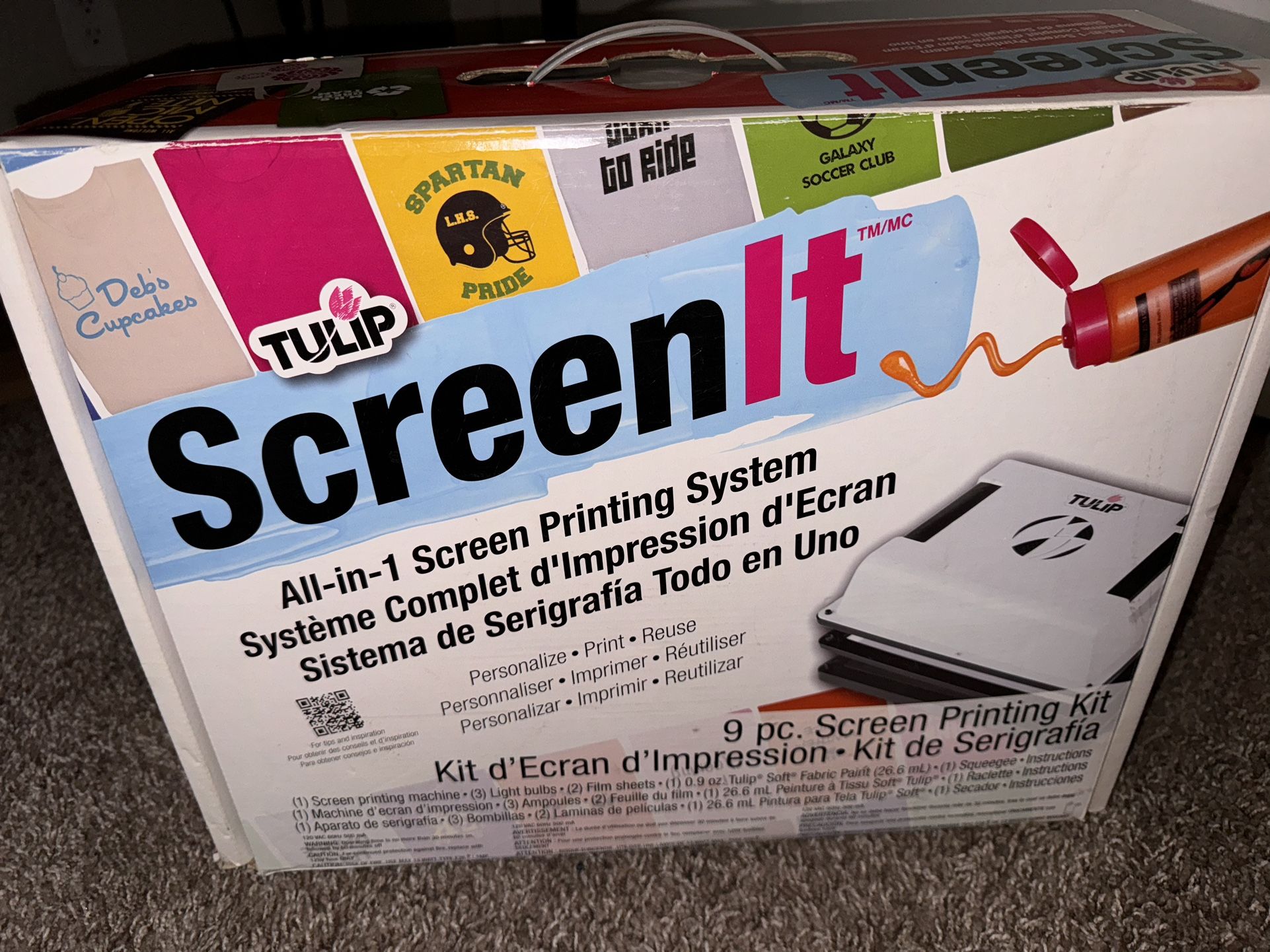 Like new used once. Comes with one screen 2 light bulbs instead of 3. Tube of ink , mini squeegee . Works perfectly fine used once , no longer need