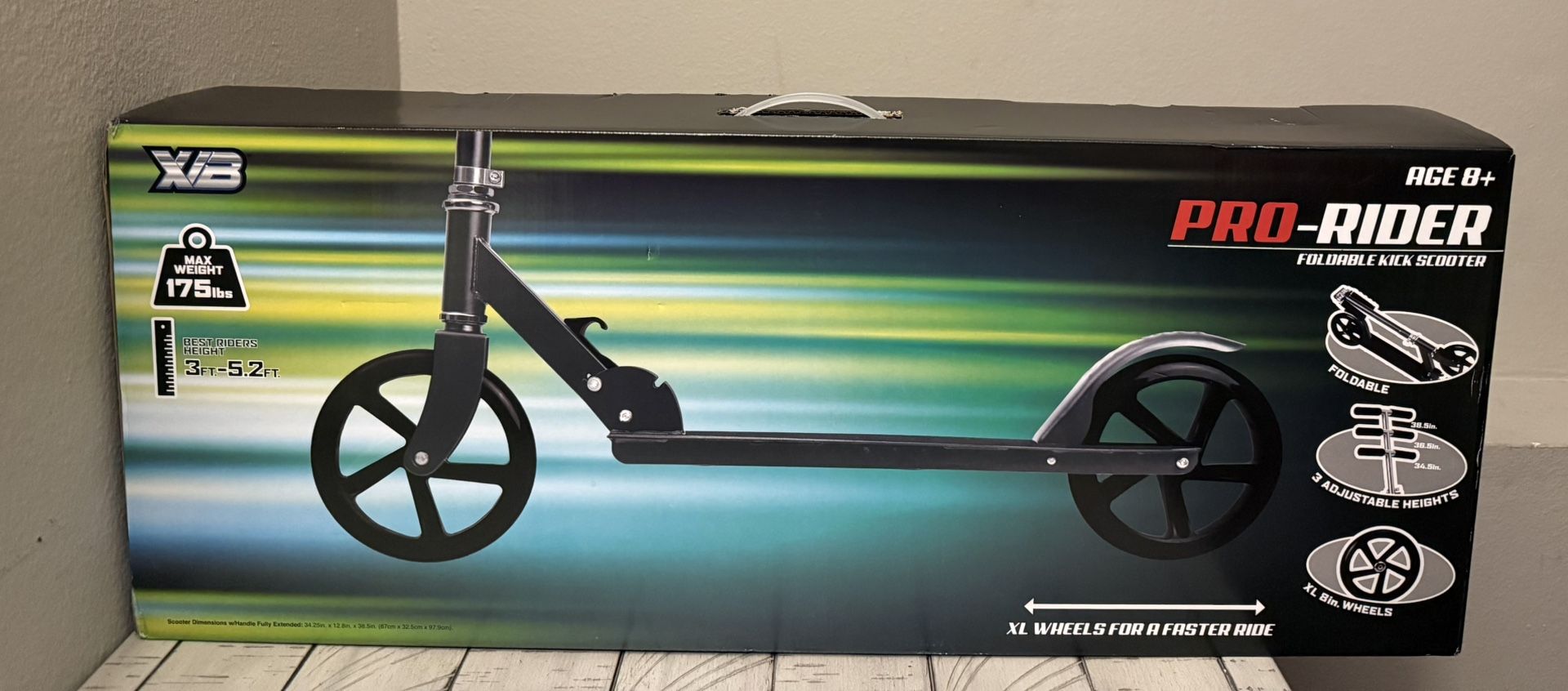 New- never opened- never used Product description Zoom in style with the XVB™ Pro-Rider scooter - super lightweight, folds easy, & perfect for cruising around the hood. Size: 34.2in x 12.8in x 38.5in Ages: 8+ Country of Origin: Imported