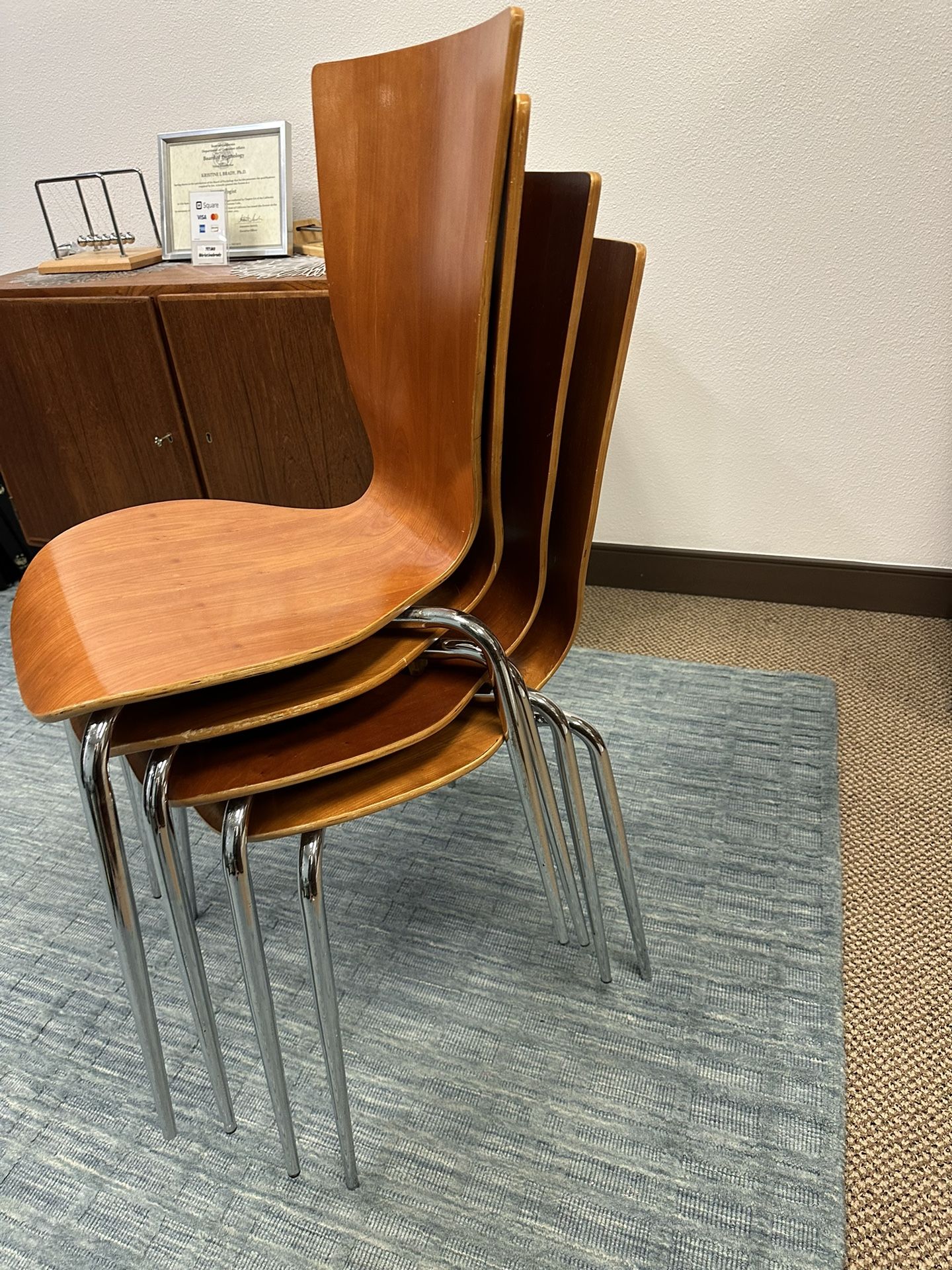 Vintage Mid-century Danish chairs that are in great condition. These chairs are hard to find in such good quality, especially a matching set of 4 chairs. These are well -built, stack neatly, and are remarkably comfortable. I prefer to sell them together, but will consider selling them in pairs. 2 chairs: $450 All four: $775