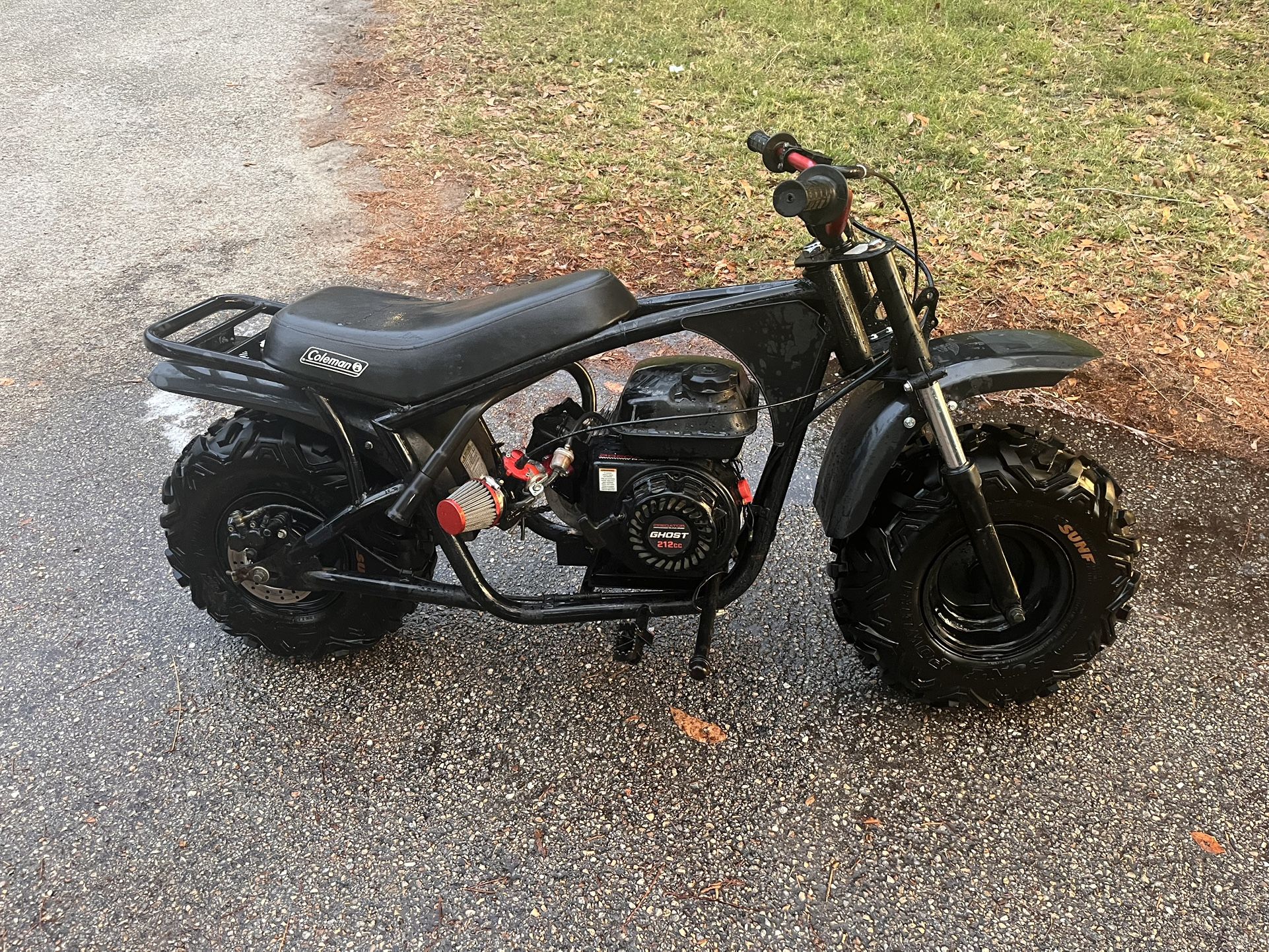 Coleman frame with a predator 212 cc ghost racing engine with billet rods and pistons, hydraulic brakes and racing carb and air intake and upgraded front suspension and motorcycle handlebar.