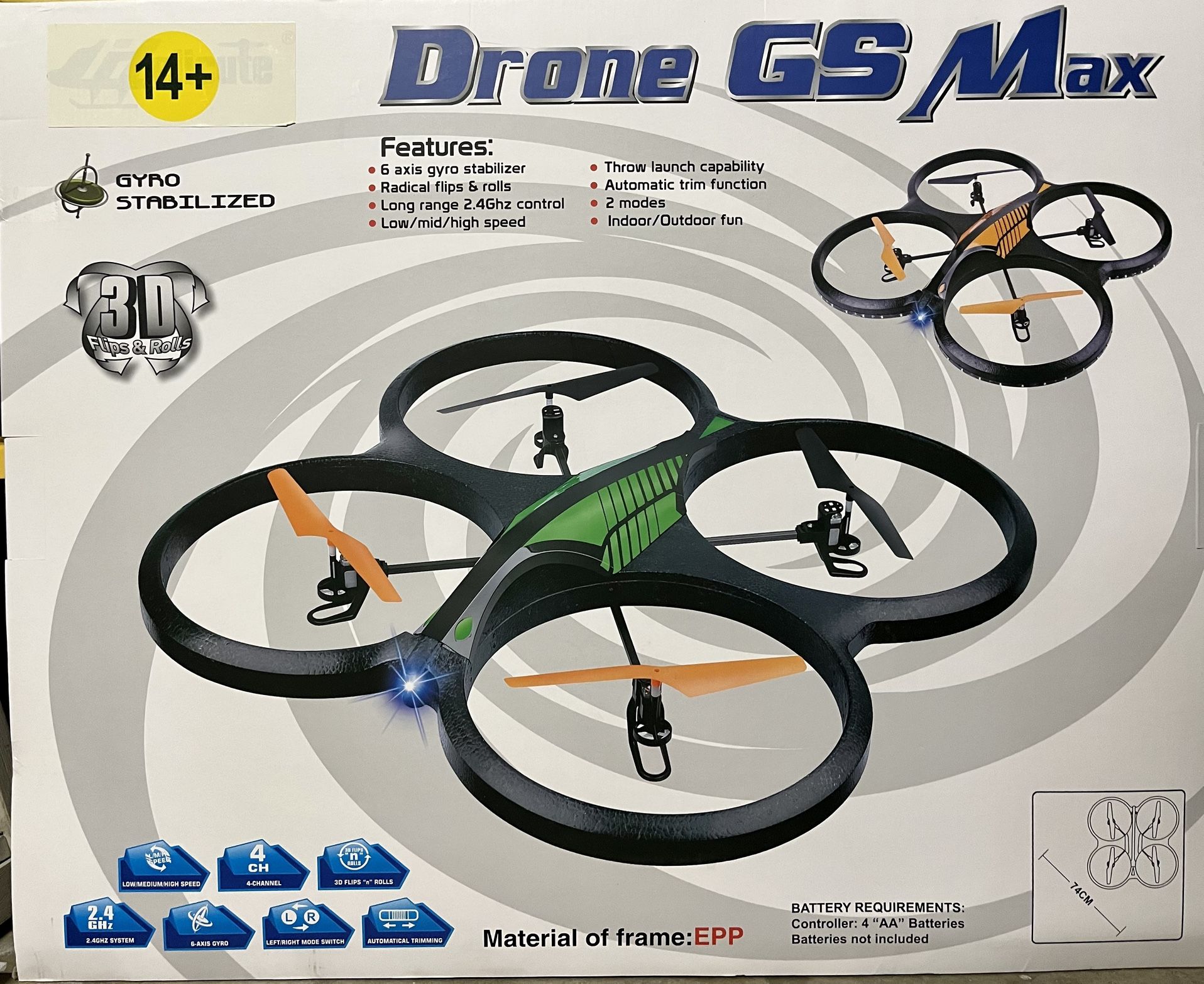 -Transmitter 2.4 GHz (50-60 meters range). -6-axis Gyroscope. -4 channels. -Compass of geo-positioning technology. -Lithium battery. (Between 7 and 9 minutes). -3-speed. -3D FlipRoll. -LED lights. -Optional camera (photo and video), not included. -Indoor outdoor. -Made of FOAM and carbon fiber. -Dimensions: 60 x 60 x 9 cm. -Load in electric network. -4 AA batteries not included.
