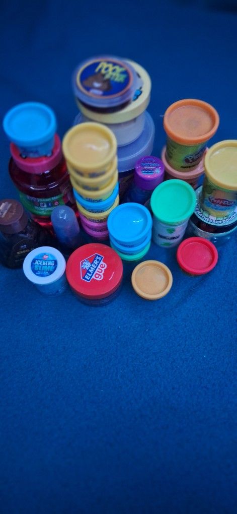 A bunch of different slime and play dough, all in very good condition, some may have been used once but they are all completely clean and dont dry out if they are in the containers.