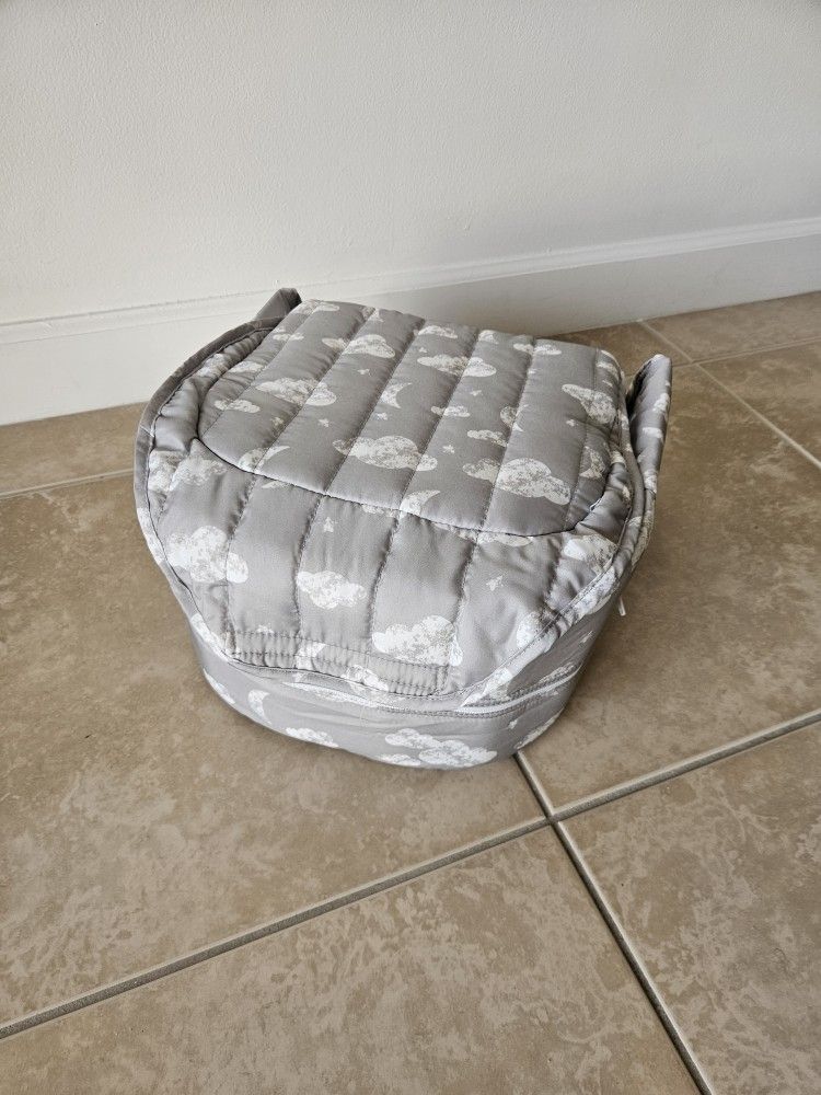 Very good condition, gently used Baby Delight Snuggle Nest portable bassinet in the Silver Clouds pattern. Washable cushion cover.