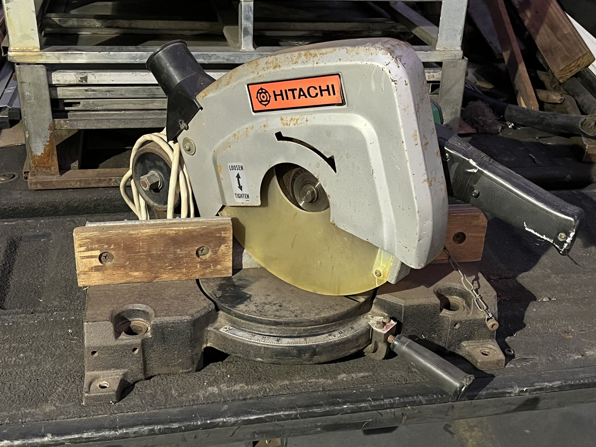 Hitachi 12 amp miter saw. It has a carbide blade. The saw and stand are weathered but it runs fine. The stand is nothing special but the saw is a heavy piece. Not an inexpensive household saw. The particle board top shown here is weathered and I’ve discarded it. At my place in Irvine.