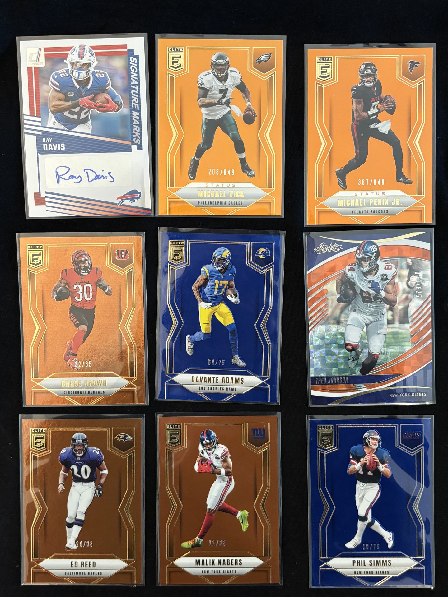 NFL numbered card lot – 9 cards total. Includes autograph and multiple low numbered parallels. Ray Davis Signature Marks AUTO Chase Brown Bronze /35 Ed Reed Bronze /35 Malik Nabers Bronze /35 Davante Adams Blue /75 Phil Simms Blue /75 Michael Vick Status Orange /849 Michael Penix Jr Status Orange /849 Theo Johnson Orange Mosaic /825 All cards are near mint and sleeved. Great lot for collectors or resellers. $100 for everything Open to reasonable offers