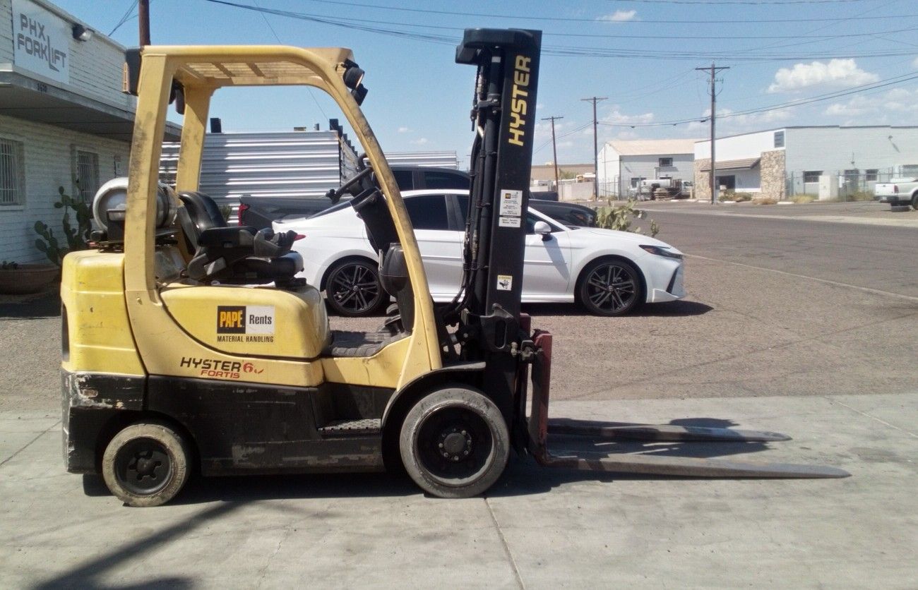 2005 Hyster S60FT Forklift. Three-stage mast - 187" (15.58 feet) max fork lift height, sideshifter with tilt functions, 6000lb base capacity, cushion tires, propane fuel - GM Vortec 2400 engine, 60" forks, lever-shift automatic. 857 hours. This Hyster lift truck is in good working condition. Available for purchase.