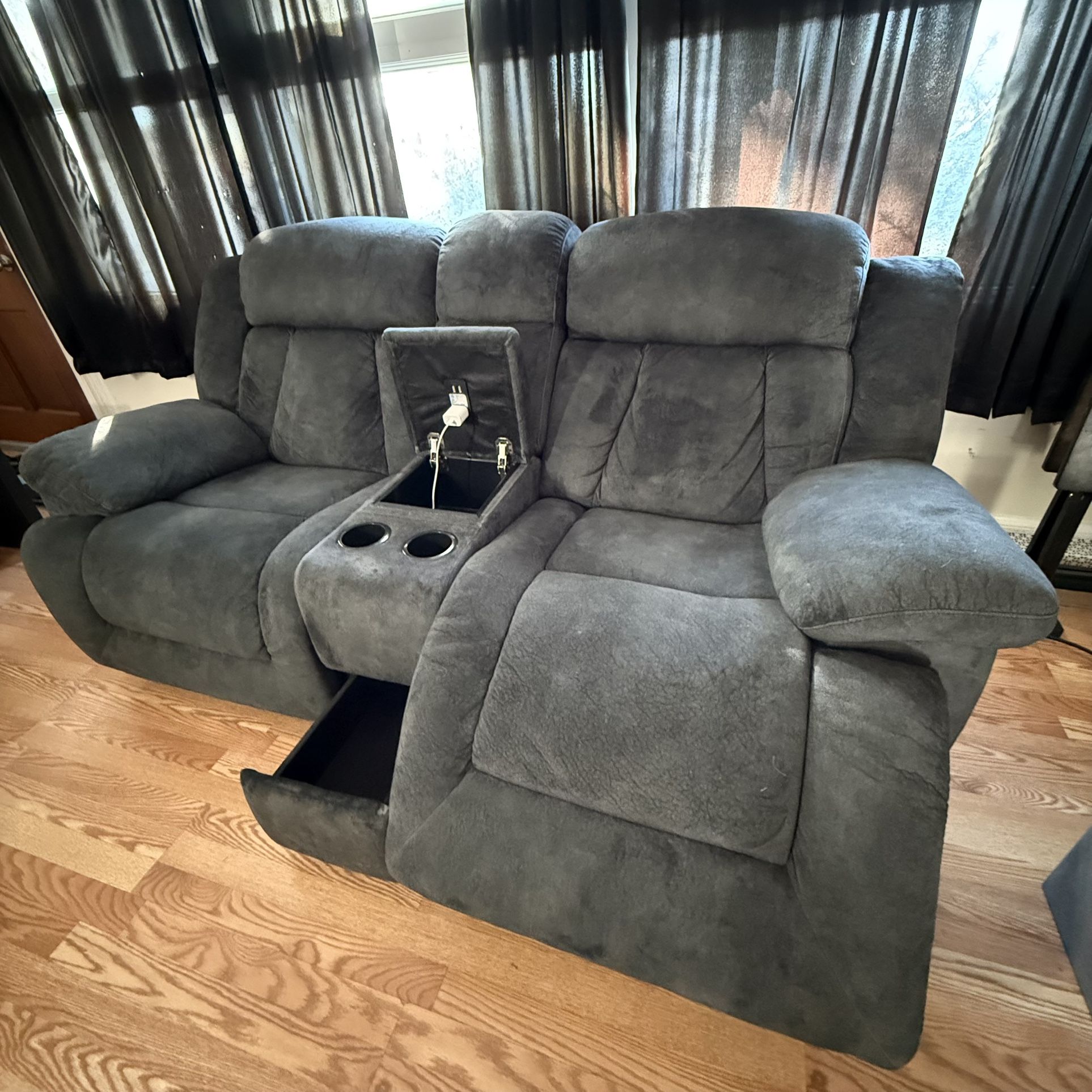 - Leggett and Platt Recliner - Approximately 80 in. wide and 36 in. deep - Dark Grey, Slate Grey, Charcoal Grey, Cadet Grey in color - Deep 22 in. seats for comfort - 1 Leg and 1 Head Recliner per side - 4 USB charging ports - 2 storages in the middle console - 1 standard 3 prong outlet in top middle console - 2 cup holders - Couch comes apart in to 8 individual pieces for easy transportation and build - 2 seat Suede Couch, 2 seat Suede Sofa, Suede Loveseat