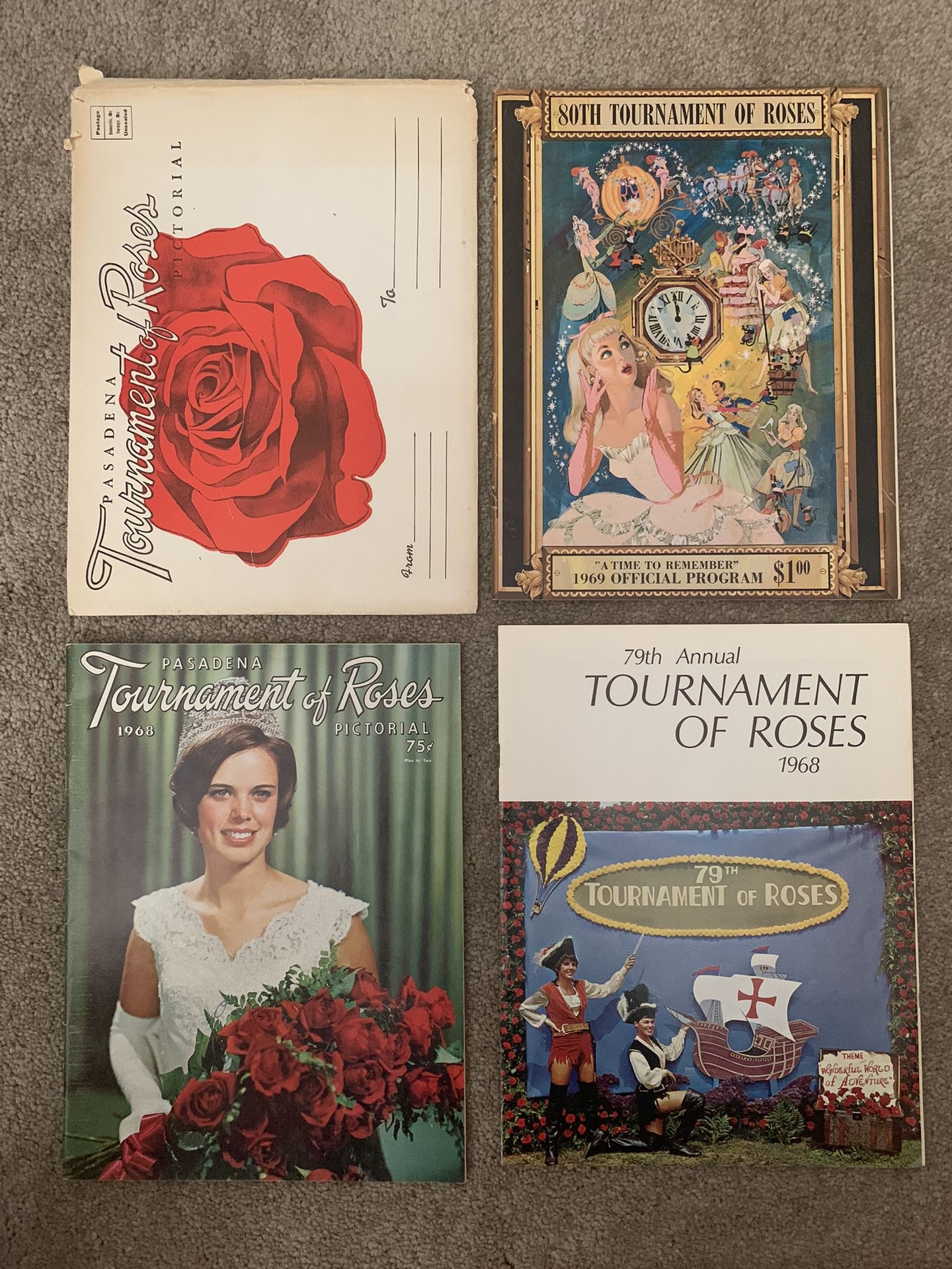 Tournament of roses programs 1968, 1969 and 1968 pictorial with original envelope that held the 1968 pictorial. All in very good to good condition excellent color and graphics .