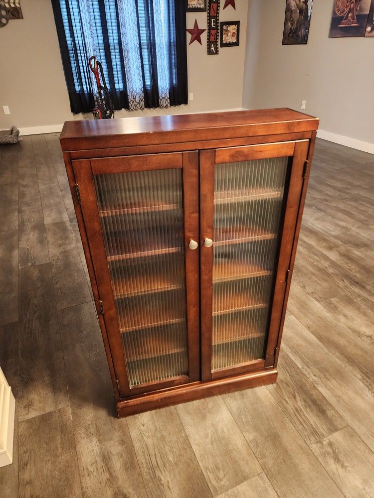 Sturdy wooden cabinet with glass doors and multiple shelves. 45" tall, 28" wide, 8.5" deep