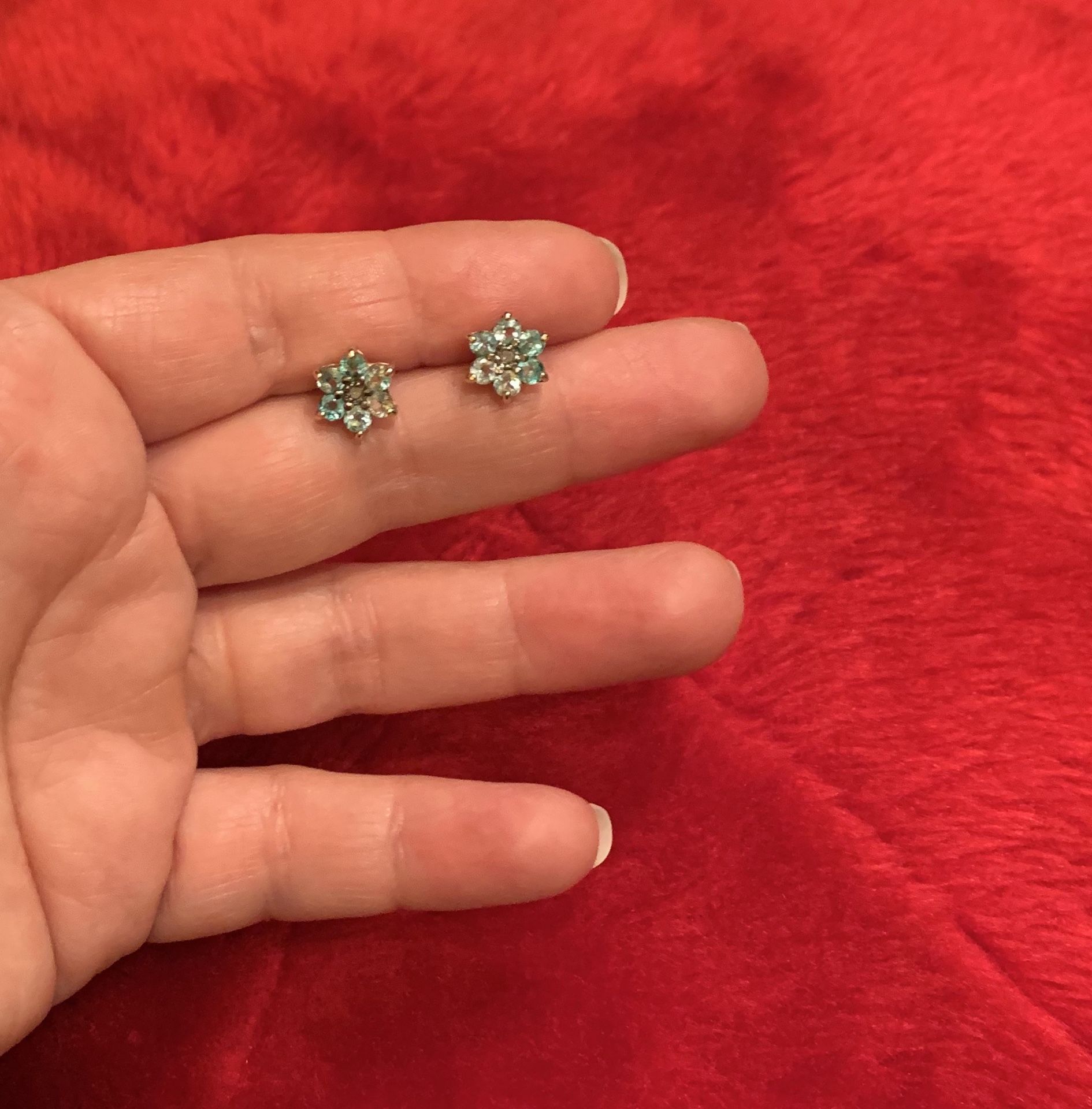 I bought these earrings for $110. They are 925 sterling silver and gold plated. Honestly I don’t know what kind of stone they have perhaps just crystal. They are very cute but not easy to capture a good picture of them. I tried my best. Used a couple of times. Perfect condition.