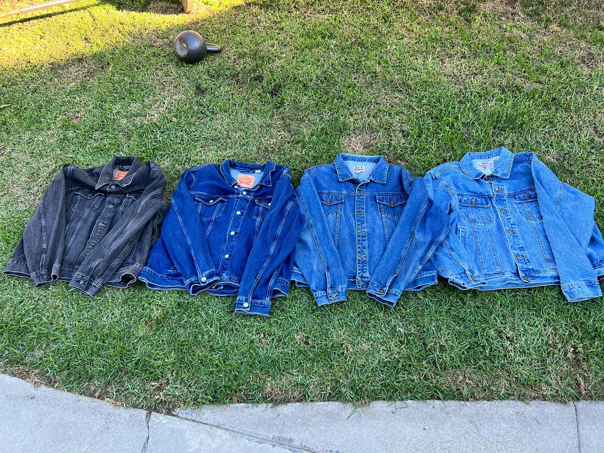Set of 4 vintage denim jackets - black, navy, and light blue finds Two Levi’s Denim Jackets NWOT Wrangler Rugged Wear worn in Ely Cattleman worn in Beautiful complete set of different variations of Denim Jackets to add to your wardrobe to fulfill a complete style All 4 are 100% Cotton No holes, No significant damage ***kettlebell not for sale, ignore it***