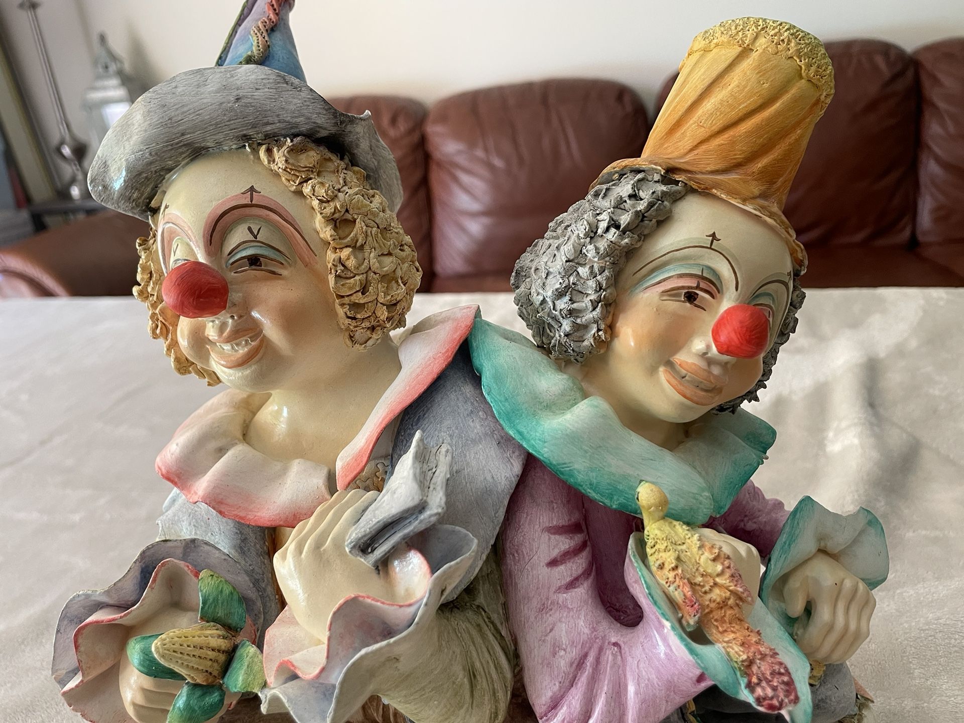 Local pickup only. Cash only. Imprinted Guzman signature and name of piece on the base! Good size: Measures 10 1/8" Tall And Approx. 10 1/4" In Length And Approx. 6 1/2" In Width. ** Priced low because of a chip on the cuff of the clown on the right (shown in picture 4) - not uncommon for this piece and because of its age - but otherwise in pristine condition. The colors are spectacular and bright. This unique handcrafted ceramic figure from Colombia is a must-have for any collector of decorative sculptures. The artisan, Guzman, has skillfully created a circus clown figure with intricate details and vibrant colors that will add a touch of whimsy to any space. This item is not only visually appealing but also holds cultural significance as it is a representation of the traditional craftsmanship found in Colombia. Made with care and attention to detail, this handmade ceramic statue is a perfect addition to your collection.