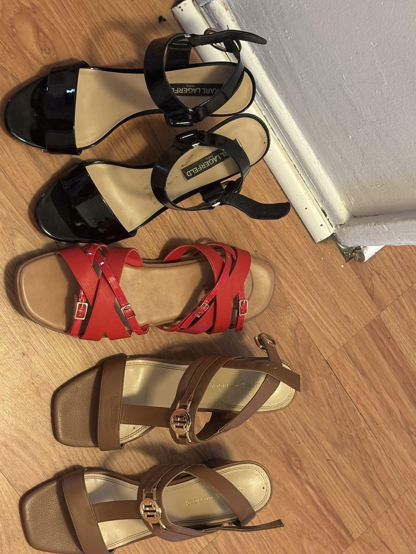 All three items have been worn once for events Been in my closet for about three years , all in good use . Size 10 the feel is sturdy enough to walk in them all night long Black ( KARL LAGERFELD) Red (ALDO) Brown (TOMMY HILFIGER )