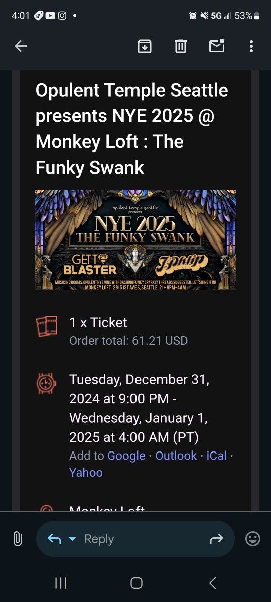 1 ticket to the Monkey Loft tomorrow night. Transferable. Unfortunately I got sick and can no longer attend. Message or text me Deena (253)nine-four-eight-8289