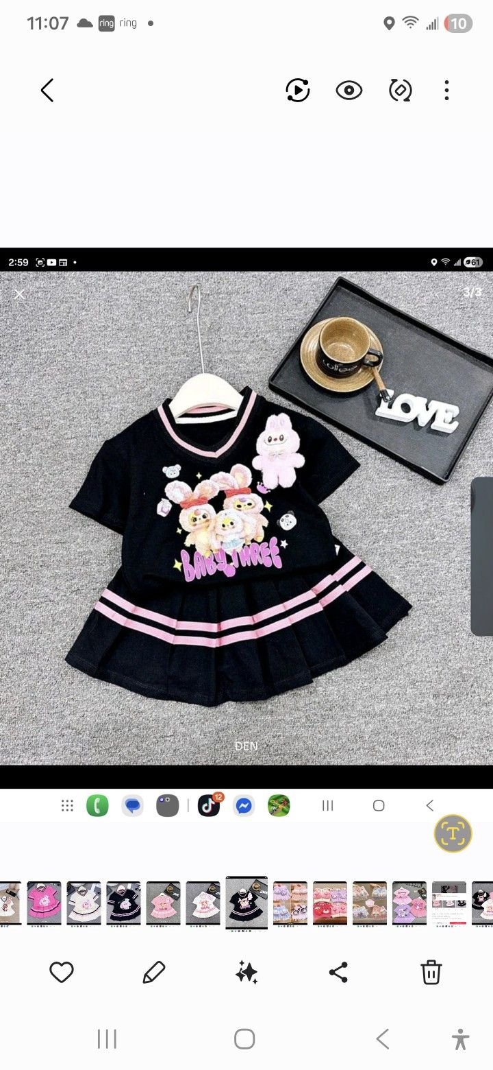 Kids set shirt short sleeve and skirt Black color. Size 10 skirt can stretch from 8 nch to 14 inch Shirt 16 inch wide and 18 1/2 long Labubu design.