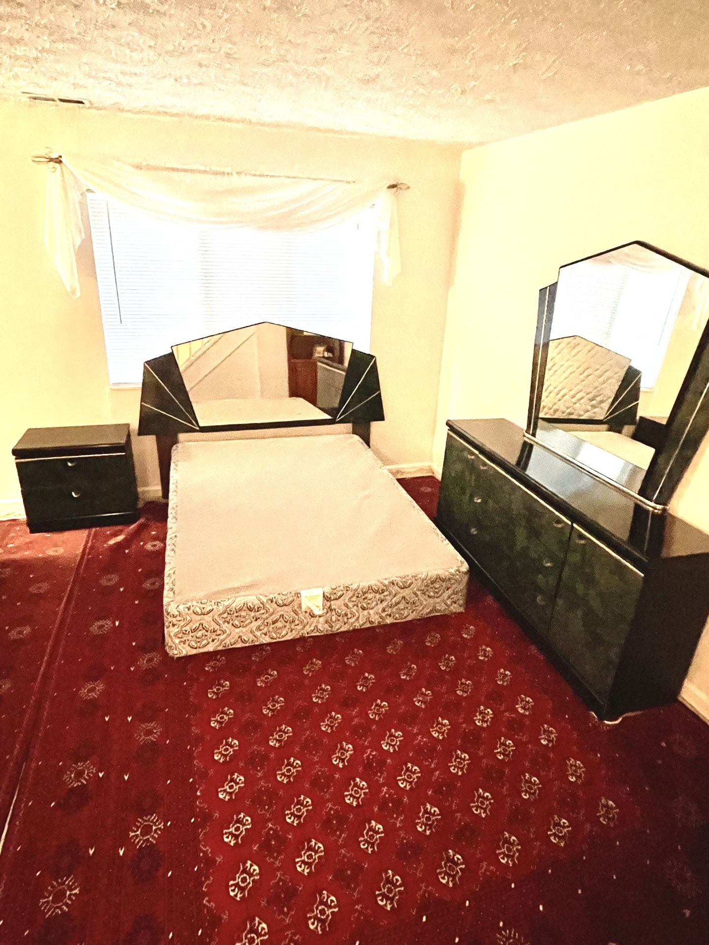 Must See Real wood in Dark Green/Black color. The set is in great condition, with minor wear and tear. Mainly, used in a guest room. Set includes Dresser: High 29" x wide 63" deep 15.5" Side Table: High 22" x wide 24" deep 15" Dresser Mirror Headboard(Mirror)fits a Full or Queen size frame The full-size Box spring is Free