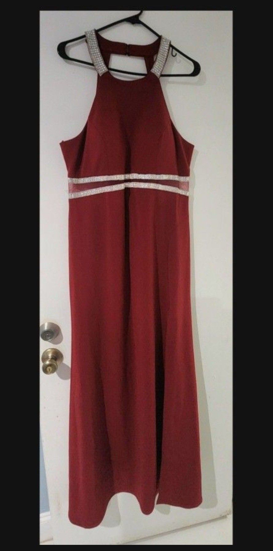 Bought this dress from Jcpenny. I was a bridesmaid, but there was not a wedding, just pictures. It is a deep dark red wine/ burgundy color with beautiful embellishments and see-through strip under the breast all around