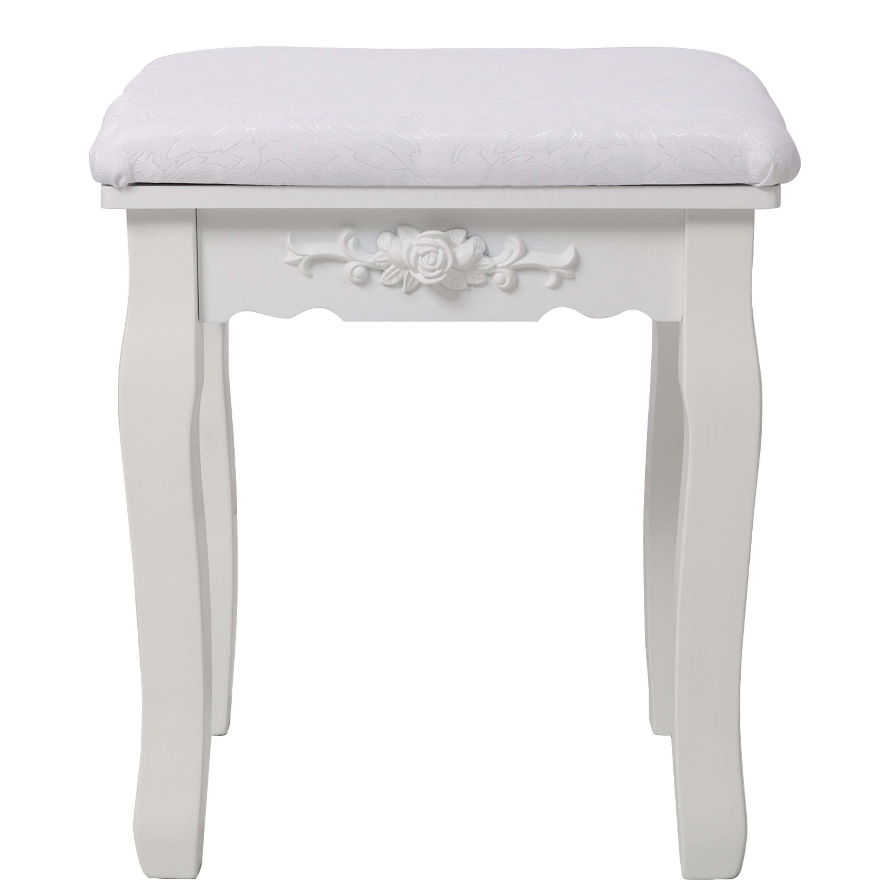 White Princess Vanity Desk Set with Mirror & Cushioned Stool, 4-Drawer Wooden Makeup Vanity Table for Girls' Bedroom, Dressing Table with Ample Storage Package Size : Length (in.): 32.30 Width (in.): 20.50 Height (in.): 13.80 Weight (lbs.): 40.00 Product Dimensions : Assembled Length (in.): 29.50 Assembled Width (in.): 15.80 Assembled Height (in.): 55.00 Product Weight (lbs.): 34.50 【Vanity Desk with 360° Rotating Mirror】This white vanity comes with a 360° swivel mirror, fully adjustable to your ideal viewing angle for all makeup and grooming needs. 【Spacious Tabletop & 4 Drawers for Ample Storage】Equipped with a large tabletop and four practical drawers, this vanity desk offers generous storage space for all your makeup, jewelry and beauty accessories. The two bottom drawers are extra-large for bulk storage, while the double-layer tabletop design enables neat classification—letting you find all your essentials at a glance. 【Comfortable & Multi-Purpose Stool】The stool is padded with high-density sponge for long-lasting resilience and durability, and its decorative patterned upholstery boosts visual appeal while ensuring great breathability. Beyond a vanity stool, it also doubles as a piano bench, shoe bench or footrest, making it a versatile addition to your home. 【Premium Materials & Sturdy, Stable Frame】Crafted with a smooth MDF tabletop and legs, this vanity set boasts a robust, wobble-free structure for long-term use. Non-slip foot pads add extra stability and protect your floors from scratches. 【Stylish Home Accent & Effortless Assembly】With a sleek, modern design, this makeup vanity seamlessly complements your existing home furniture and acts as a chic decorative piece for any bedroom or dressing area. Assembly is a breeze, with clear, easy-to-follow instructions and all necessary hardware included in the package. W465P391680 CA8