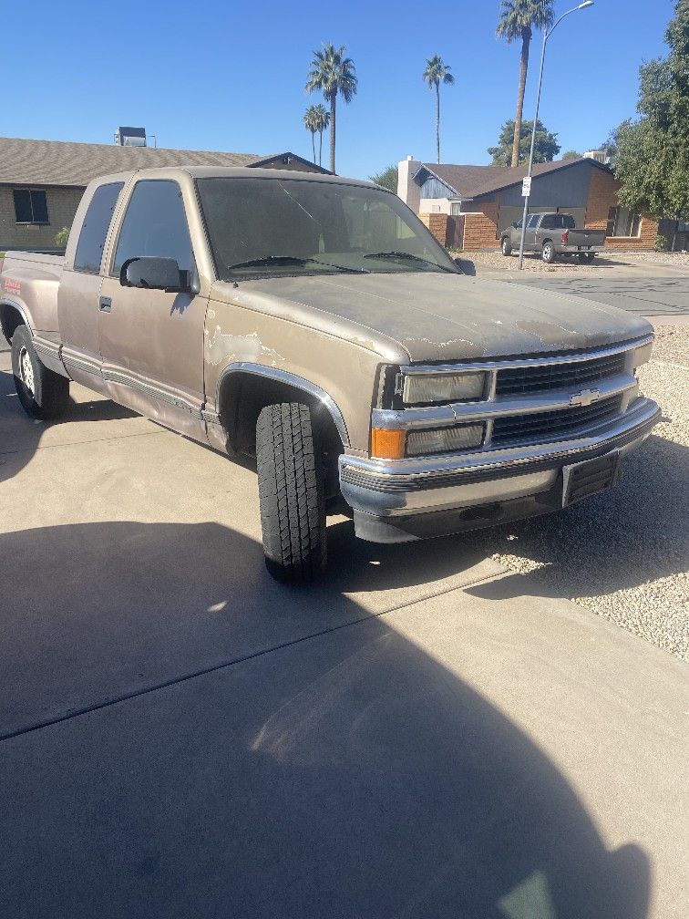 1995 Chevy Silverado two door truck 2 door. It’s need a power steering belt a gasket for the oil pan which is leaking, and it has about a 150,000 miles, no air conditioning. Won’t move at this time. Needs to be towed off the property. Property is in Phoenix, not Gilbert. Has a few dents in it but the engine has a big block 5.7.