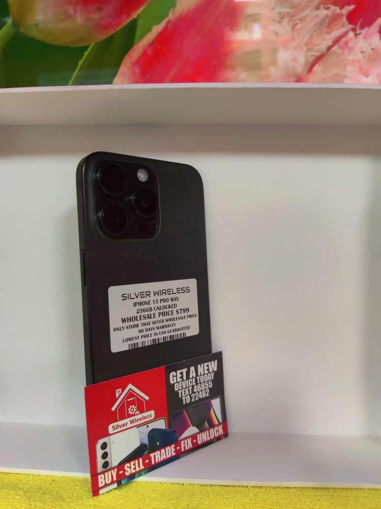 IPHONE 15 PRO MAX 256GB FACTORY UNLOCKED PERFECT CONDITION FINANCE AVAILABLE 50 DOWN PAYMENT 90 DAYS WARRANTY SILVER WIRELESS 1610 E CHARLESTON SUITE 110