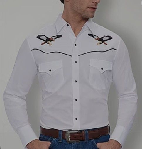 Ely Cattleman Mens Long Sleeve Western Shirt Snap Up With Embroidered Eagles. Men's Size XL NEW WITH TAGS Embroidered with eagles, this traditional western shirt lets you show off your American pride. With contrast piping on the yokes and a classic snap front, this shirt is all-American at its best.