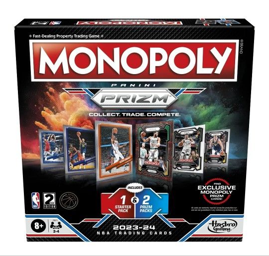 MONOPOLY PRIZM: NBA 2ND EDITION BOARD GAME: Get fired up for more trading, collecting, and competing in the Monopoly Prizm: NBA 2nd Edition board game—with 2023-24 Monopoly Prizm cards FIND EXCLUSIVE MONOPOLY PRIZM CARDS: Includes 16 Panini NBA trading cards (one 8-card Starter Pack and two 4-card Prizm Packs) featuring Luka Doncic, Kevin Durant, and more DRAFT NBA SUPERSTARS AND ROOKIES: Use Panini trading cards to draft NBA players or trade them with opponents! Check out the Player Ratings and Stats on the back of each card PROPERTIES ARE NBA GAMES: Move around the board, trying to take control of as many NBA Games as possible. Earn points when opponents land on them—and when beating others in NBA player matchups. Get the most points to win COMPETE FOR NBA AWARDS: At GO, try to win an NBA award! A player chooses an opponent, and they compete for points by revealing and comparing the NBA player stats on the backs of their Panini cards