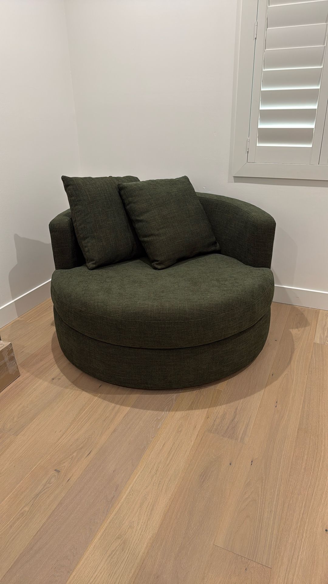 50” diameter. Never been used. Green Balboa Swivel chair. Retails for $2,200