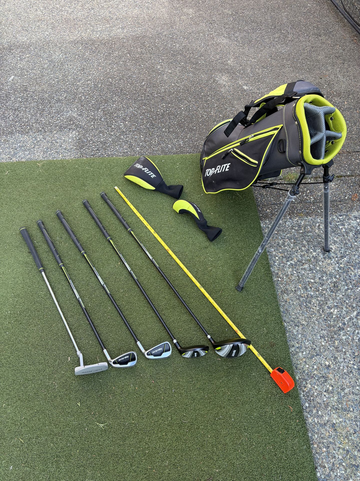 Driver, hybrid, 7 iron, sand wedge, putter. Driver shaft is 31 inches - see picture of tape measure. Clubs in excellent condition. Comes with bag and headcovers