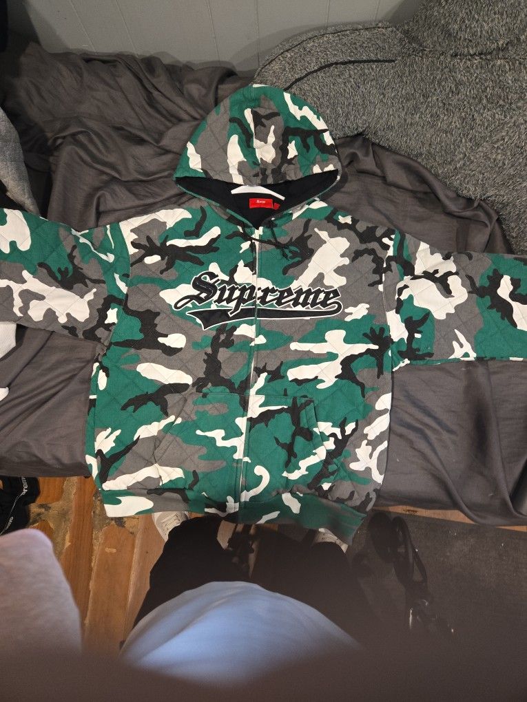 Supreme quilted zipped up hooded sweatshirt in a green camo colorway Size XL Brand new