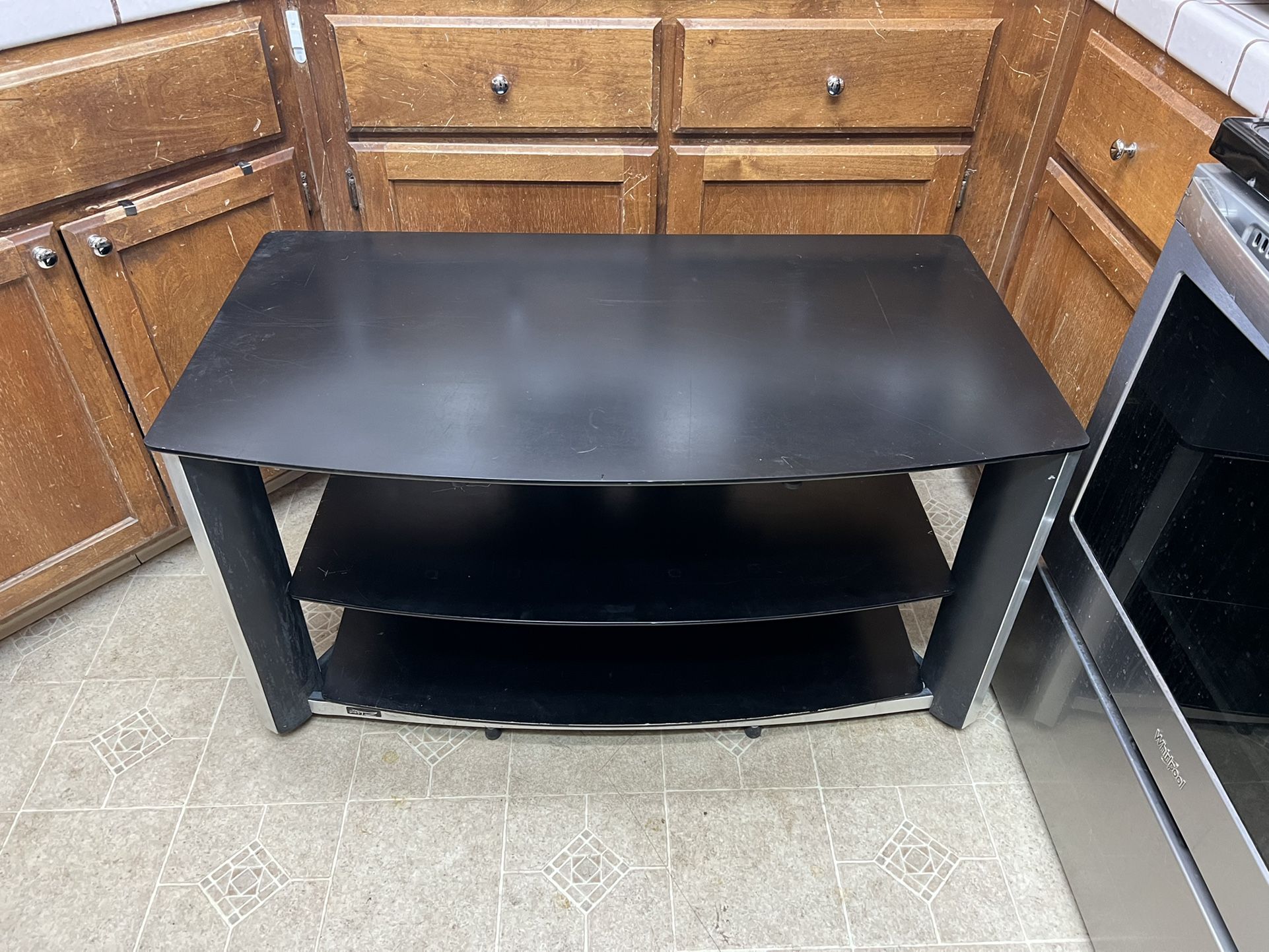 Serious buyers only please. TV stand. The shelves are glass. Good condition. No holds or trades. Measurements are 43 inches by 24 inches. 23 inches tall. No holds or trades. Pick up.