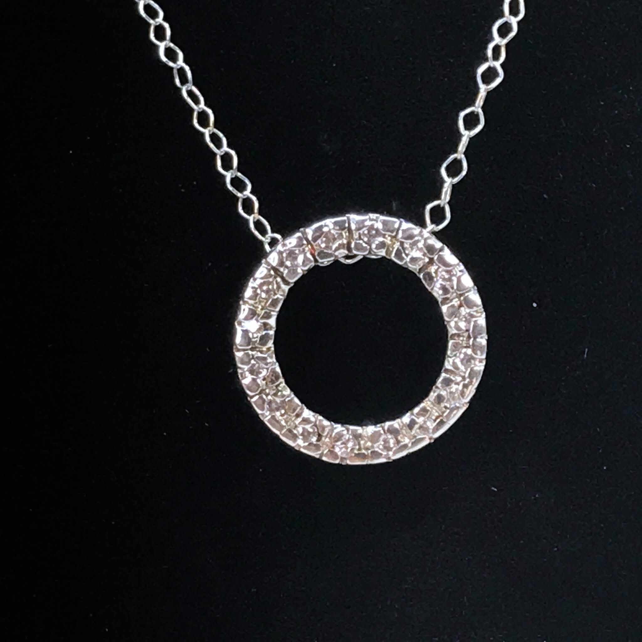 Sterling silver necklace with a sliding halo pendant. The pendant has a textured front with a ring of clear cubic zirconia stones around it. Pendant: 9/16" diameter. 18"L. Marked "925" and "FAS" inside the back of the pendant. Marked "925" on the spring ring clasp. Good condition.